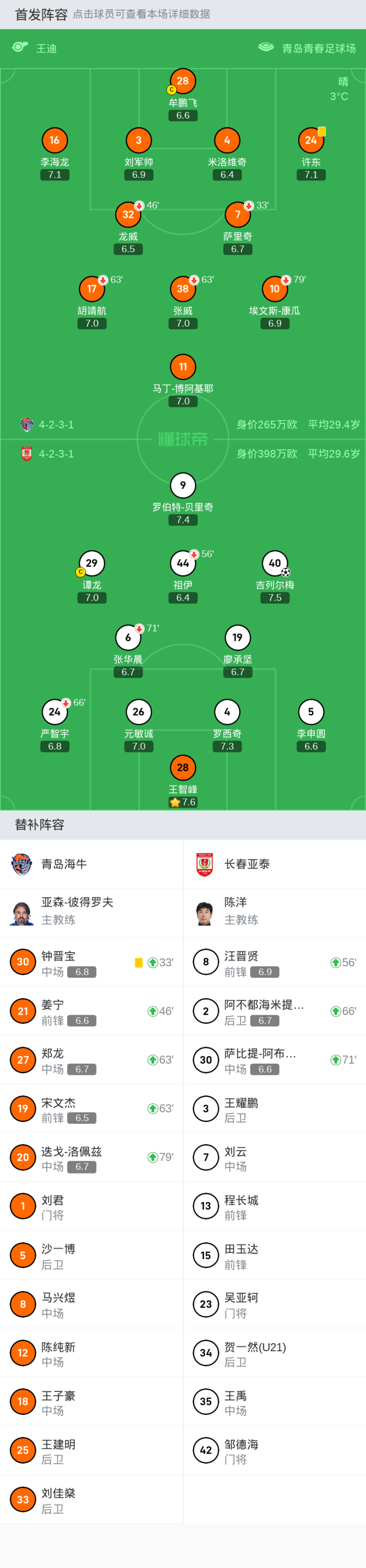 青岛海牛首发:28-牟鹏飞, 7-萨里奇, 4-米洛维奇, 10-埃文斯-康瓜, 24-许东, 32-龙威, 3-刘军帅, 17-胡靖航, 16-李海龙, 11-马丁-博阿基耶, 38-张威