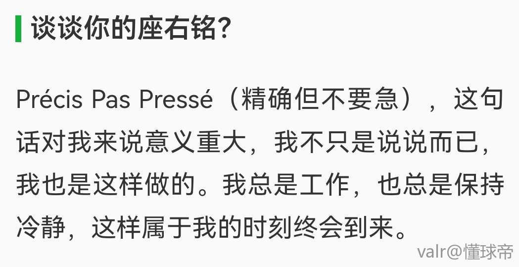 Précis Pas Pressé(精确但不要急),这句话对我来说意义重大,我不只是说说而已,我也是这样做的。我总是工作,也总是保持冷静,这样属于我的时刻终会到来。