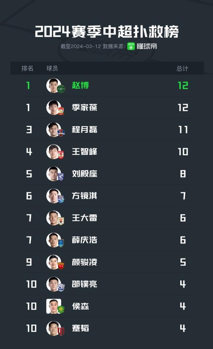 扫描下载懂球帝首页>动态> 中超最新扑救榜:新晋国门赵博、西海岸门将季家葆12次居首