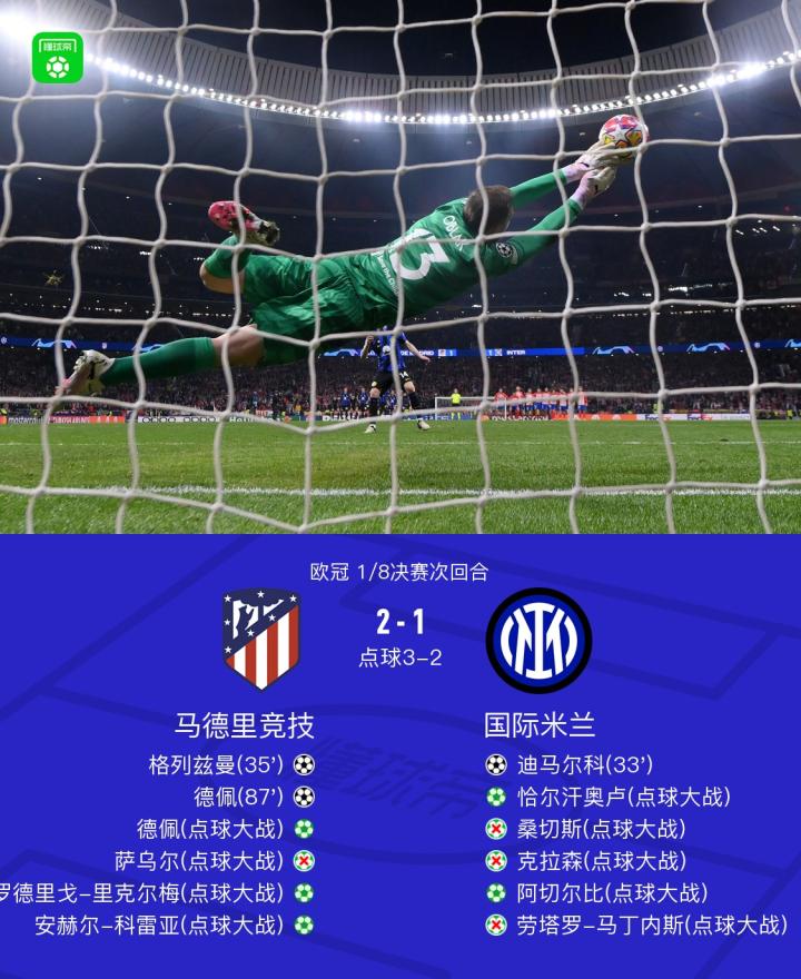 北京时间3月14日欧冠 1/8决赛次回合,马德里竞技主场对阵国际米兰。上半场巴雷拉助攻迪马尔科破门,国米后卫解围变助攻,格列兹曼禁区转身破门,下半场图拉姆失单刀,德佩破门绝平,90分钟两队总比分战平,加时赛两队均无建树。点球大战奥布拉克两度扑点,劳塔罗将最后一个点球直接射上看台,最终马竞总比分5-4战胜国米挺进八强。