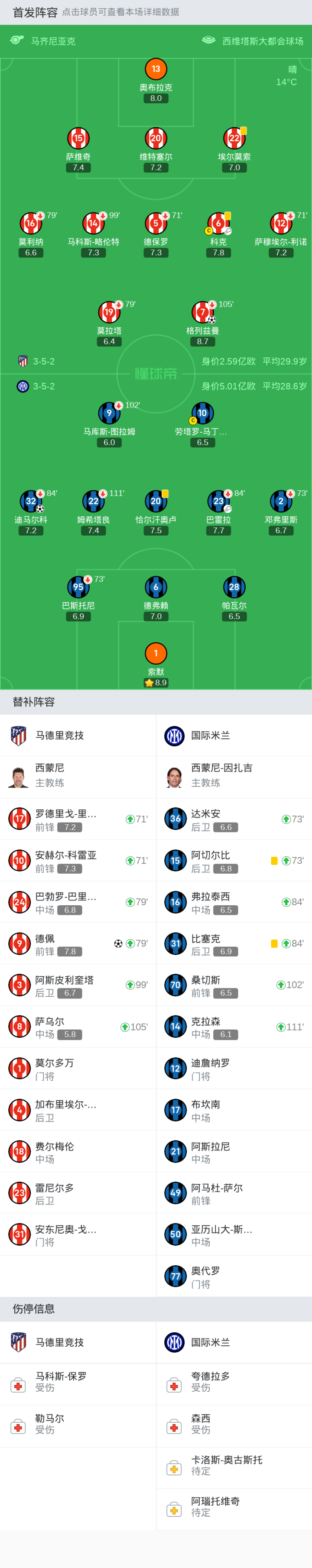 马德里竞技首发:20-维特塞尔, 13-奥布拉克, 15-萨维奇, 7-格列兹曼, 19-莫拉塔, 6-科克, 5-德保罗, 22-埃尔莫索, 14-马科斯-略伦特, 16-莫利纳, 12-萨穆埃尔-利诺
