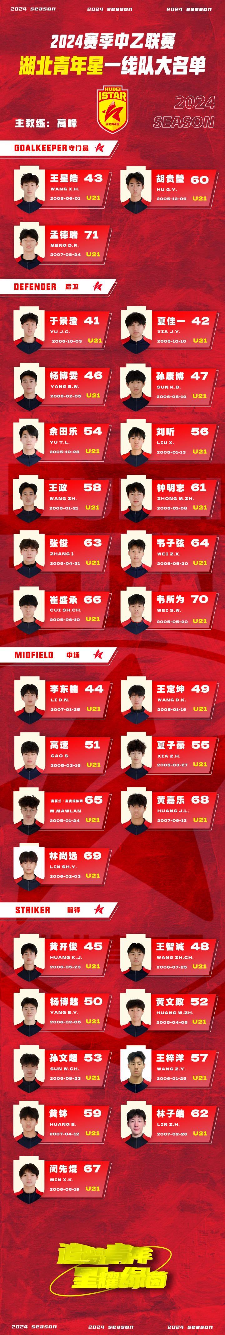 2024中乙联赛将于3月23日重燃战火。上赛季,湖北青年星足球俱乐部在联赛第一阶段压哨进入冲甲组,并最终位列联赛第8名。赛季结束后,俱乐部荣获优秀社会责任俱乐部奖,同时主教练高峰荣获中乙联赛年度最佳主教练提名。新赛季,球队首次报名共计31名球员,整体实力更加年轻化,更具冲击力,共由26名2005、2006年龄段球员,5名2007年龄段球员组成,平均年龄仅17.8岁,球队将以全员U21阵容参加本赛季中乙联赛和足协杯赛事。这也再次体现了湖北青年星足球俱乐部大力培养年轻球员的决心和信心。新赛季,我们将继续在湖北省体育局、湖北省足球运动管理中心和湖北省足球协会的支持和指导下,团结一心,众志成城,全面在职业赛场上展现青春力量,全力实现2025年粤港澳大湾区全运会争冠目标。