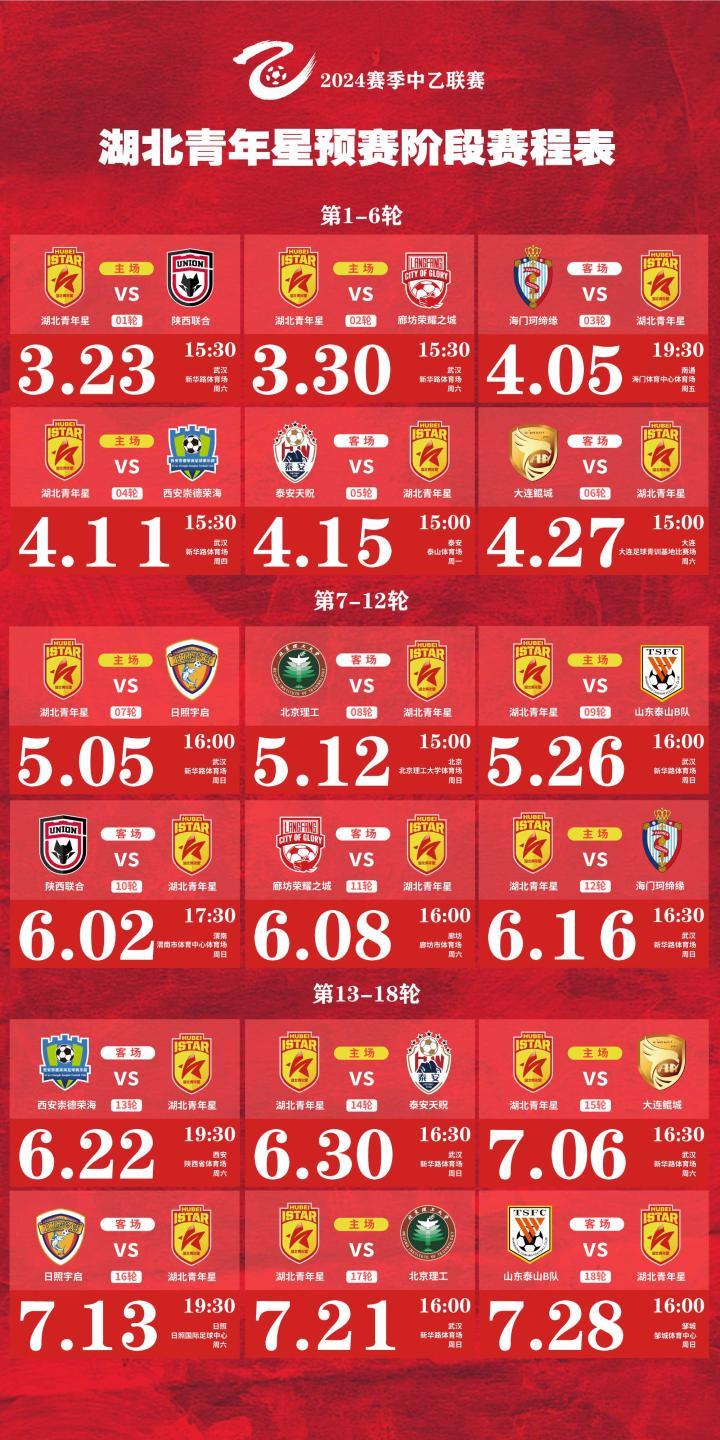 追梦青年,星耀绿茵。新的赛季赛季已经到来,新的较量就要开始。我们将继续在新华路体育场一起见证热爱,书写未来!3月23日下午3点30分,湖北青年星将坐镇主场新华路体育场迎战来访的陕西联合队。欢迎广大球迷踊跃关注和支持!