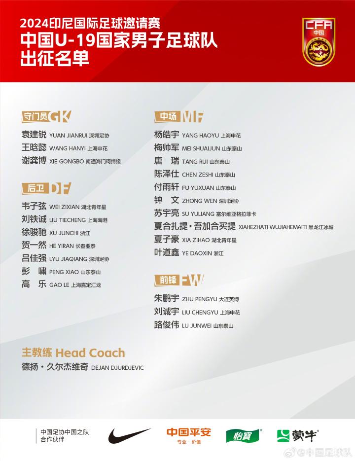 3月20日,中国足球队官方发布了U19男足出征雅加达国际邀请赛的名单。