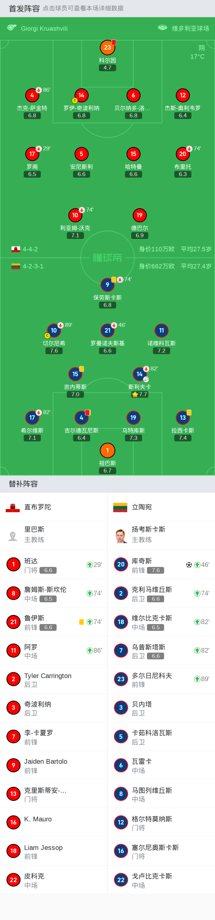 上场替补:74'2-克利马维丘斯, 82'18-维尔比克卡斯, 82'7-乌普斯塔斯, 89'23-多尔日尼科夫, 46'20-库奇斯