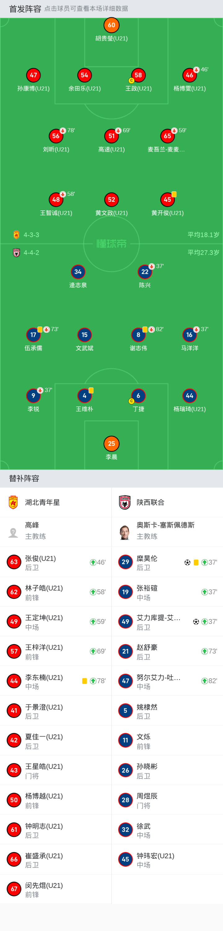 替补:43-王星皓(U21), 67-闵先焜(U21), 61-钟明志(U21), 50-杨博越(U21), 66-崔盛承(U21), 42-夏佳一(U21), 41-于景澄(U21)
