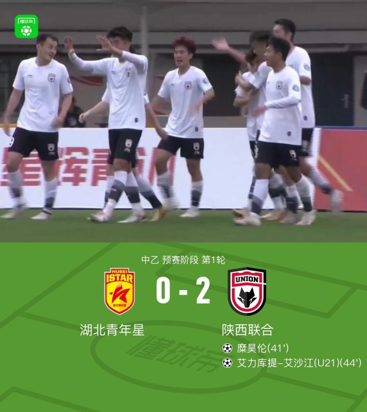 北京时间3月23日中乙 预赛阶段 第1轮,湖北青年星主场对阵陕西联合。陕西联合糜昊伦破门,艾力库提-艾沙江破门。最终比分湖北青年星0-2陕西联合。