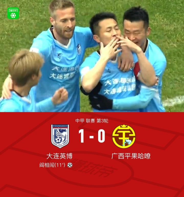 扫描下载懂球帝首页>动态> 大连英博1-0广西平果哈嘹开局三连胜领跑,阎相闯制胜球