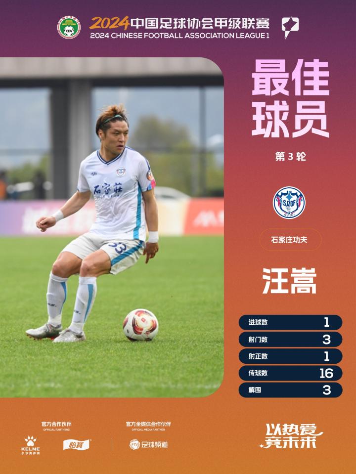 官方消息,替补建功的汪嵩当选中甲联赛第3轮最佳球员。