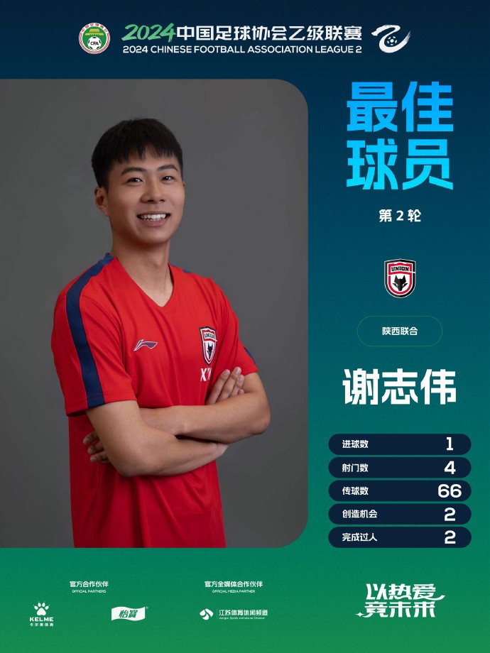 中乙联赛官方宣布,陕西联合球员谢志伟当选第2轮最佳球员。