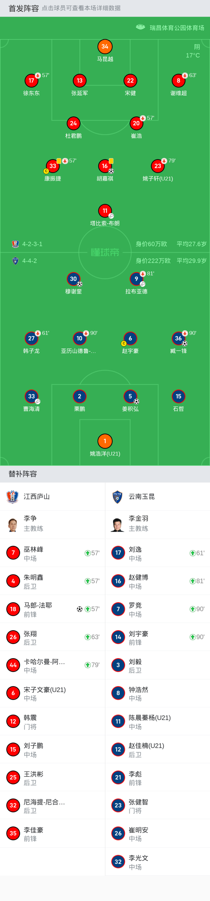 替换下场:63分钟8-谢维超, 57分钟33-康振捷, 57分钟20-崔浩, 57分钟17-徐东东, 79分钟23-姚子轩