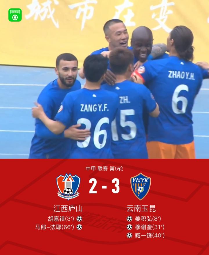 北京时间4月5日中甲 联赛 第5轮,江西庐山主场对阵云南玉昆。上半场开场不到3分钟,塔比索-布朗助攻胡嘉祺破门率先改写比分。拉布亚德助攻姜积弘破门,将场上比分扳平。曹海清助攻穆谢奎破门,将比分反超。臧一锋门前补射破门将比分扩大。下半场,马郎-法耶门前头球破门扳回一城。最终云南玉昆客场3-2逆转江西庐山。