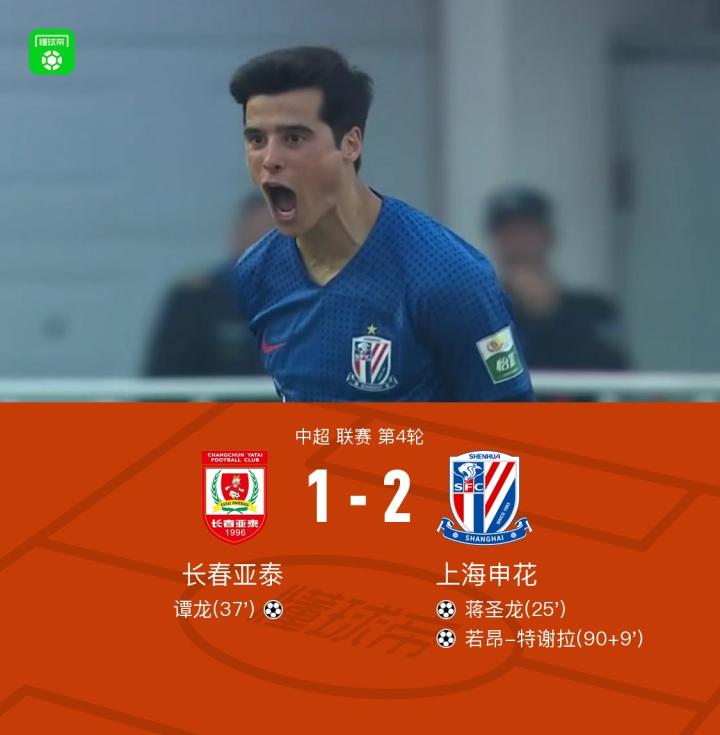 北京时间4月5日中超 联赛 第4轮,长春亚泰主场对阵上海申花。上半场谢鹏飞开出角球,蒋圣龙泰山压顶头球破门,之后谭龙头球破门扳平比分。下半场最后时刻特谢拉低射破门完成绝杀,最终申花2-1战胜亚泰斩获联赛4连胜领跑中超。