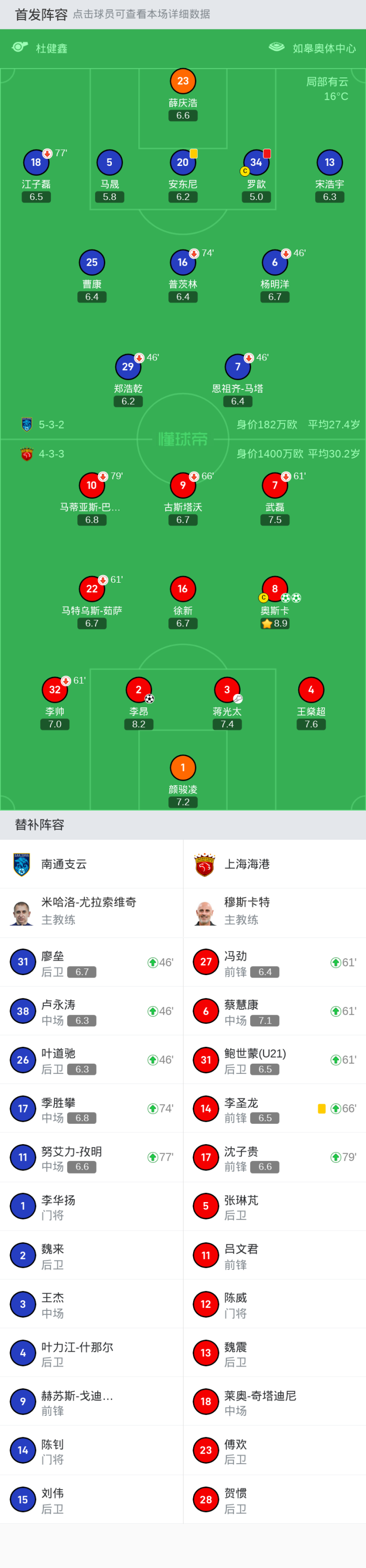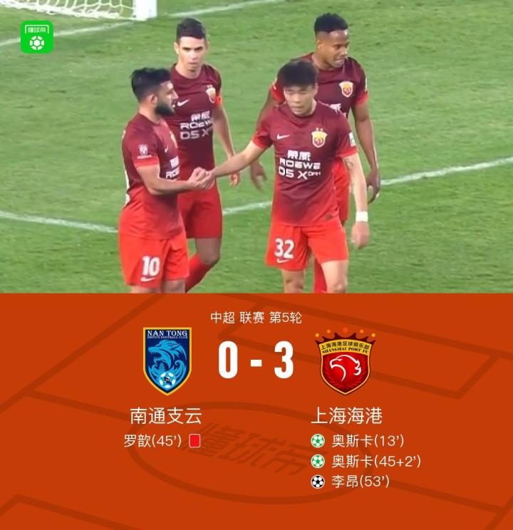 北京时间4月9日18:00,中超第5轮展开争夺,南通支云坐镇主场如皋奥体中心体育场迎战上海海港,本场主裁判为杜建鑫,VAR裁判为王巍。上半场,武磊两度造点+造罗歆直红,奥斯卡点射双响。下半场,李昂再下一城,薛庆浩出击染红被取消。最终,海港客场3-0轻取十人南通。