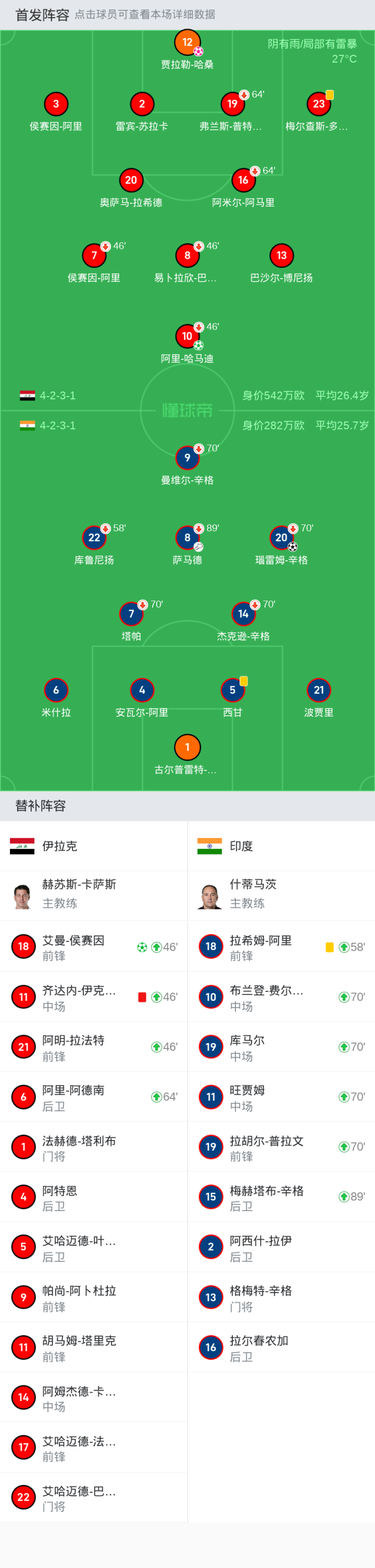 印度首发:1-古尔普雷特-辛格, 5-西甘, 7-塔帕, 21-波贾里, 9-曼维尔-辛格, 4-安瓦尔-阿里, 14-杰克逊-辛格, 22-库鲁尼扬, 8-萨马德, 6-米什拉, 20-瑙雷姆-辛格