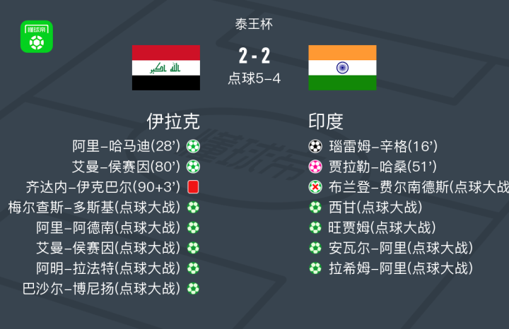 在泰王杯比赛中,伊拉克队主场迎战印度队。伊拉克队的阿里-哈马迪和艾曼-侯赛因分别攻入一球,而贾拉勒-哈桑不幸乌龙献礼。印度队的瑙雷姆-辛格也有一粒入球。最终比分为伊拉克 7-6 印度,伊拉克队获得胜利。