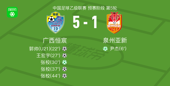 北京时间4月16日中国足球乙级联赛 预赛阶段 第5轮,广西恒宸主场对阵泉州亚新。广西恒宸郭帅破门,王宏宇破门,张校帽子戏法。泉州亚新尹杰破门。最终比分广西恒宸 5-1 泉州亚新。