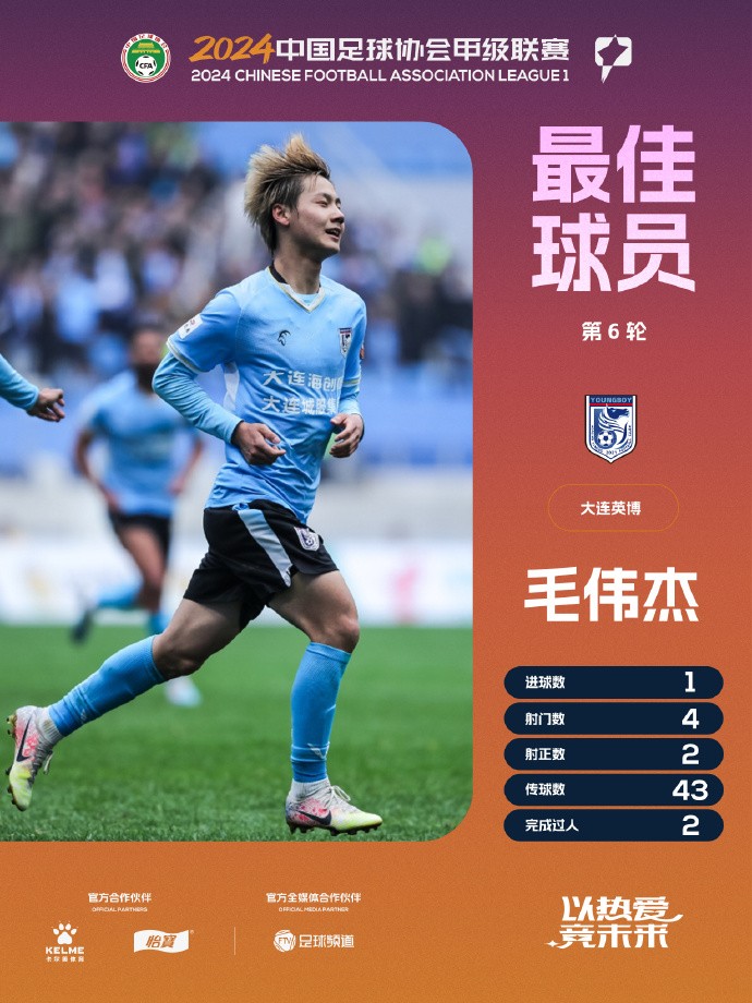 扫描下载懂球帝首页>动态> 生涯首球,中甲官方:大连英博小将毛伟杰当选第6轮最佳球员