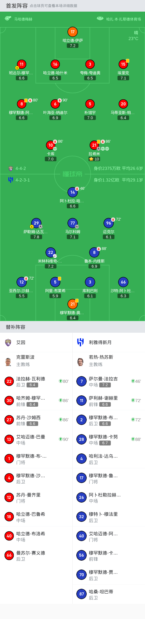 替换下场:72分钟12-亚西尔-沙赫拉尼, 88分钟8-鲁本-内维斯, 72分钟96-迈克尔, 46分钟14-阿卜杜拉-哈姆丹