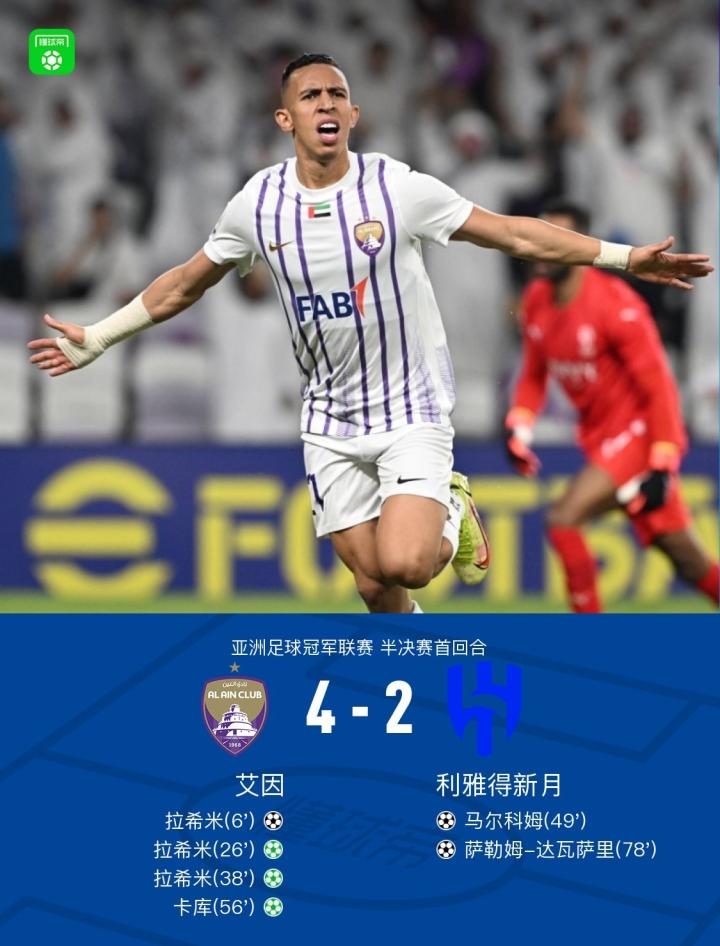 北京时间4月18日亚洲足球冠军联赛 半决赛首回合,艾因主场对阵利雅得新月。上半场刚开始,纳迪尔送出助攻,拉希米前插推射远角破门先拔头筹,哈姆丹禁区转身小角度抽射被挡出,拉希米和埃里克先后制造点球,拉希米操刀点射完成帽子戏法,下半场米林科维奇助攻马尔科姆破门扳回一城,拉希米又一次制造点球,卡库点射命中,尾声阶段达瓦萨里门前轻挑转身完成破门,全场战罢,最终比分艾因 4-2 利雅得新月。