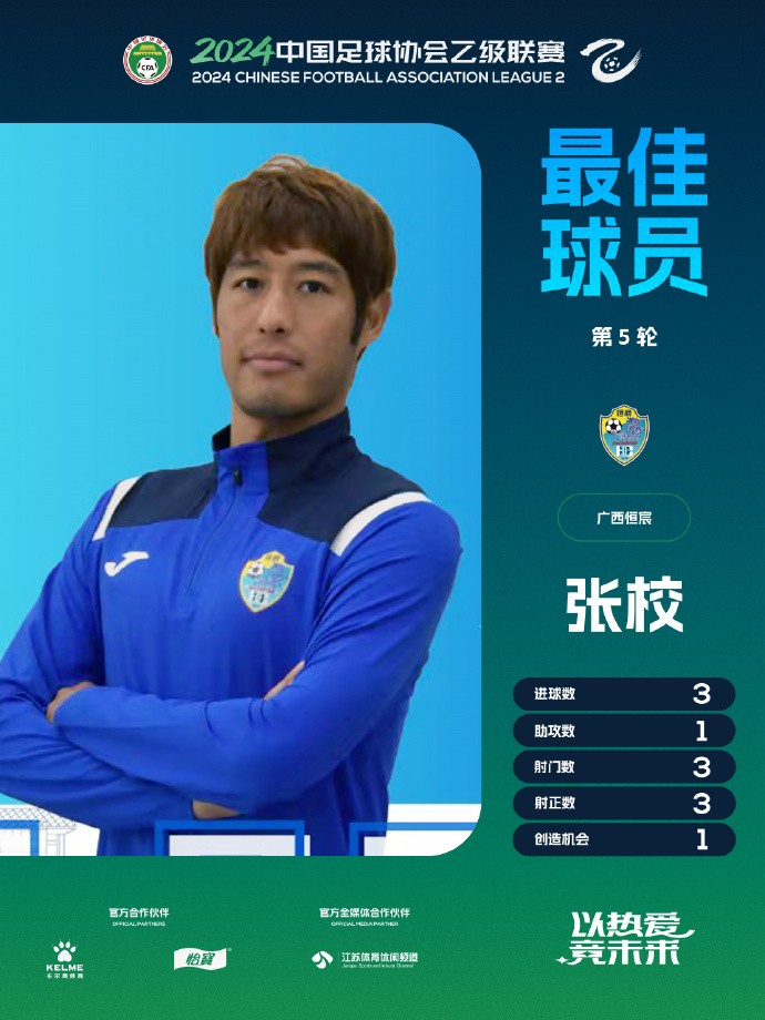 北京时间4月19日,中乙联赛官方宣布,上演帽子戏法并送上助攻的广西恒宸前锋张校当选第5轮最佳球员。
