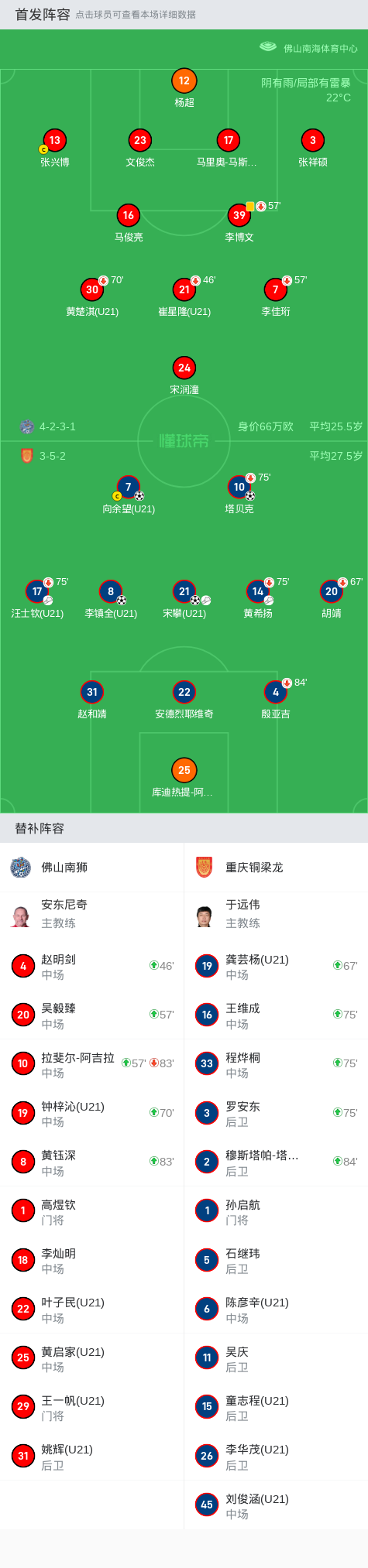 替换下场:57分钟39-李博文, 57分钟7-李佳珩, 46分钟21-崔星隆, 70分钟30-黄楚淇