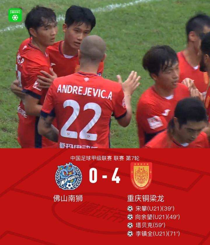 北京时间4月21日中国足球甲级联赛 联赛 第7轮,佛山南狮主场对阵重庆铜梁龙。上半场,杨超禁区内玩火险些酿成大祸。赵和靖传球,宋攀领球转身打远角得手打破场上僵局。下半场,汪士钦助攻向余望破门将比分扩大。塔贝克独闯龙潭,杀到禁区射门再得一分,李镇全弧顶附近射门再下一城。最终重庆铜梁龙客场4-0大胜佛山南狮。