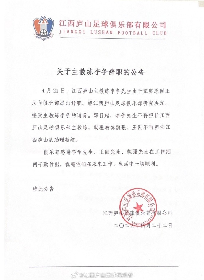 官方公告称,李争因家庭原因提出辞职。助理教练王刚、魏强同时离职。原领队肖峰因个人原因不再担任领队,由王波出任一线队教练,兼任领队。