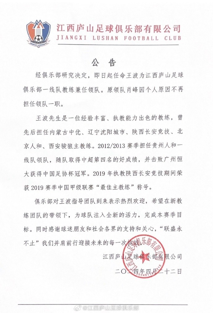 北京时间4月22日,中甲江西庐山足球俱乐部官方宣布,主帅李争辞职,王波出任一线队教练兼领队。
