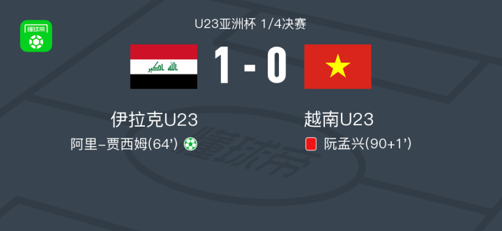 北京时间4月27日U23亚洲杯 1/4决赛,伊拉克U23主场对阵越南U23。伊拉克U23阿里-贾西姆破门。最终比分伊拉克U23 1-0 越南U23。