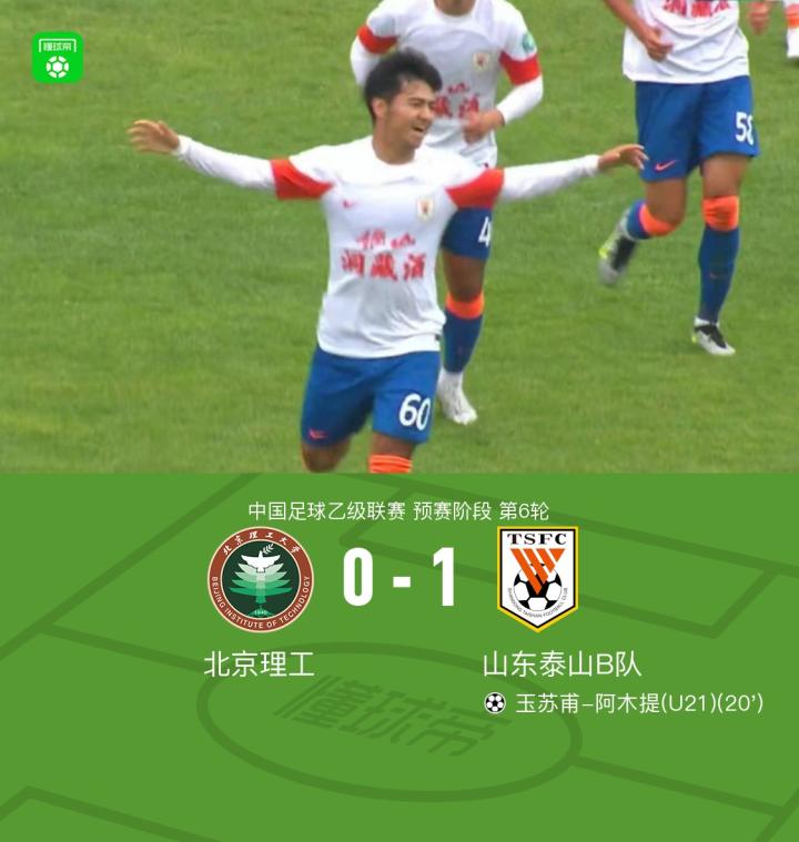 北京时间4月27日中国足球乙级联赛 预赛阶段 第6轮,北京理工主场对阵山东泰山B队。第20分钟,山东泰山B队19岁小将玉苏甫在与队友完成精妙配合后低射破门,打入全场唯一进球。最终,山东泰山B队在客场以1-0击败北京理工,收获球队本赛季中乙首胜!