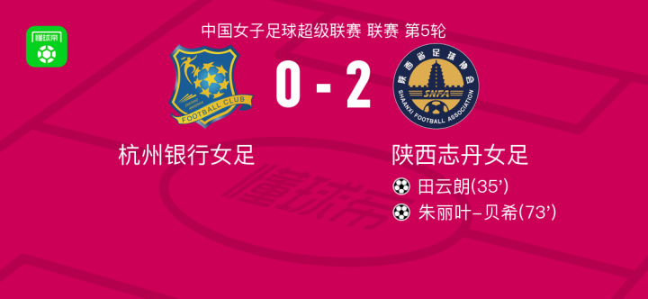 在中国女子足球超级联赛第5轮比赛中,杭州银行女足在主场迎战陕西志丹女足。田云朗和朱丽叶-贝希分别为陕西志丹女足攻入一球,最终比分为杭州银行女足0-2陕西志丹女足。