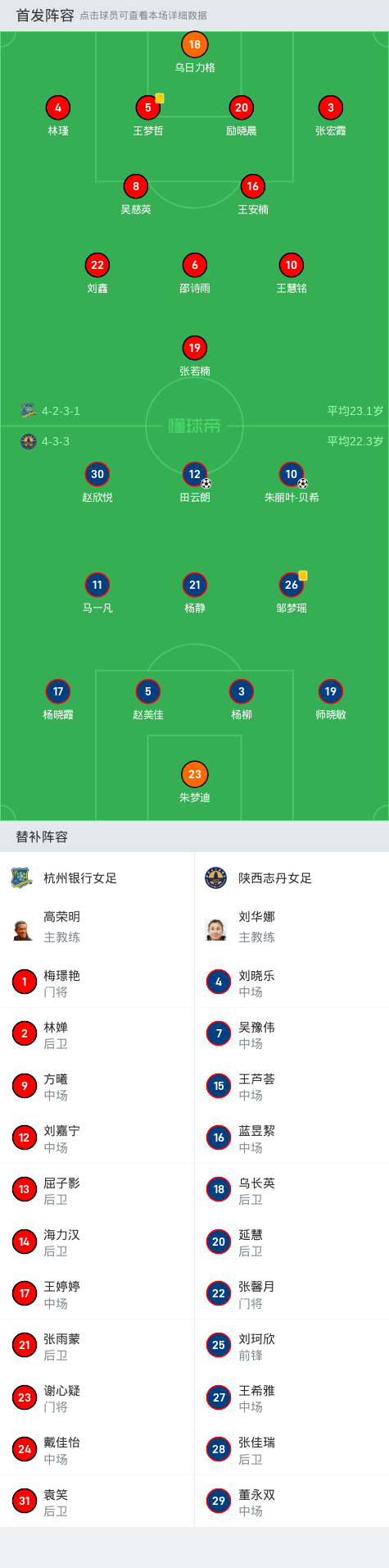 杭州银行女足首发:6-邵诗雨, 10-王慧铭, 8-吴慈英, 18-乌日力格, 20-励晓晨, 5-王梦哲, 3-张宏霞, 22-刘鑫, 4-林瑾, 16-王安楠, 19-张若楠