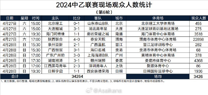 中乙第6轮观众人数:陕西主场22898人高居首位,四场观众上千