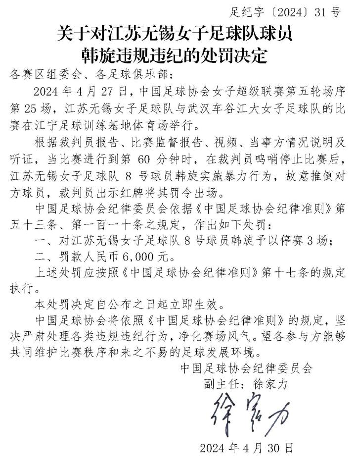 中国足协开出罚单,江苏无锡女足韩旋停赛3场,罚款6000元。