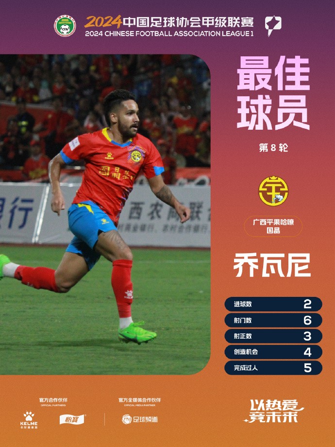 北京时间5月1日,中甲联赛官方宣布,梅开二度的广西平果哈嘹外援乔瓦尼当选第8轮最佳球员。