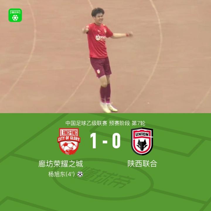 北京时间5月5日中国足球乙级联赛 预赛阶段 第7轮,廊坊荣耀之城主场对阵陕西联合。上半场陕西后防失误,魏超伦射门被扑,杨旭东补射破门。下半场周煜辰多次化解危机、最终陕西0-1客负廊坊遭遇赛季首败。
