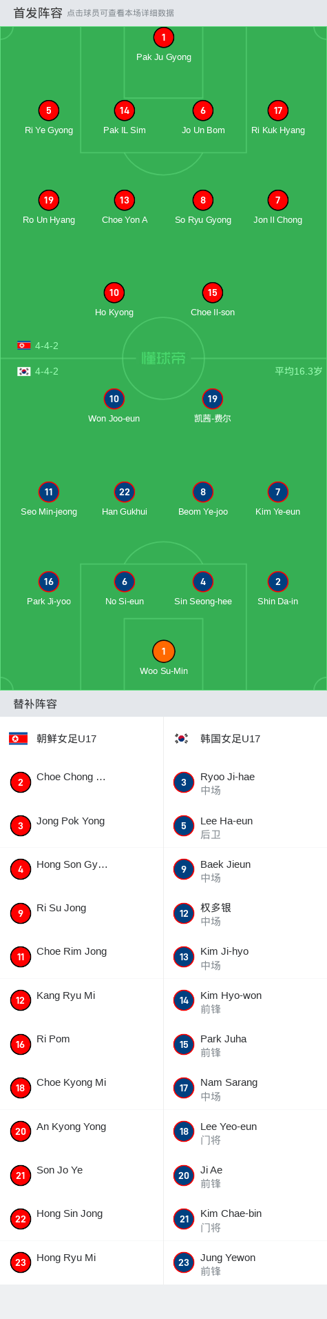朝鲜女足U17首发:15-Choe Il-son, 19-Ro Un Hyang, 17-Ri Kuk Hyang, 14-Pak IL Sim, 13-Choe Yon A, 1-Pak Ju Gyong, 10-Ho Kyong, 8-So Ryu Gyong, 7-Jon Il Chong, 6-Jo Un Bom, 5-Ri Ye Gyong