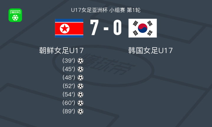 北京时间5月6日,U17女足亚洲杯小组赛首轮在朝鲜女足U17对阵韩国女足U17。最终比分是朝鲜U17 7-0 韩国女足U17。