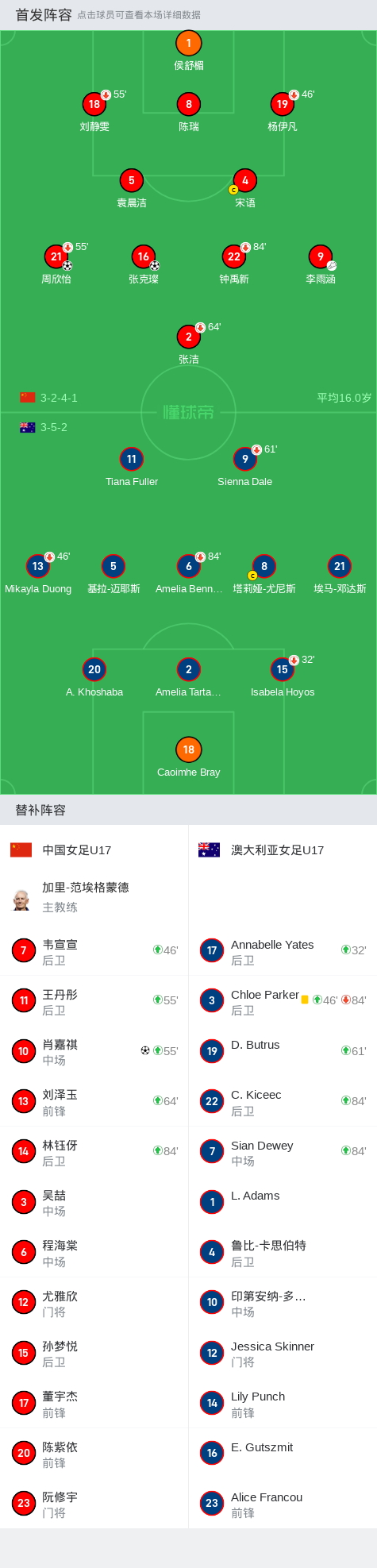 澳大利亚女足U17首发:21-埃马-邓达斯, 5-基拉-迈耶斯, 8-塔莉娅-尤尼斯, 20-A. Khoshaba, 2-Amelia Tartaglia, 18-Caoimhe Bray, 15-Isabela Hoyos, 11-Tiana Fuller, 9-Sienna Dale, 6-Amelia Bennett, 13-Mikayla Duong