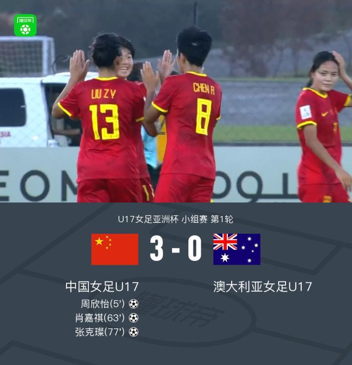 北京时间5月7日U17女足亚洲杯 小组赛 第1轮,中国女足U17对阵澳大利亚女足U17。第5分钟,周欣怡率先破门,第63分钟肖嘉祺打进一脚世界波,第77分钟,张克璨打空门得分。最终比分中国女足U17 3-0 澳大利亚女足U17。