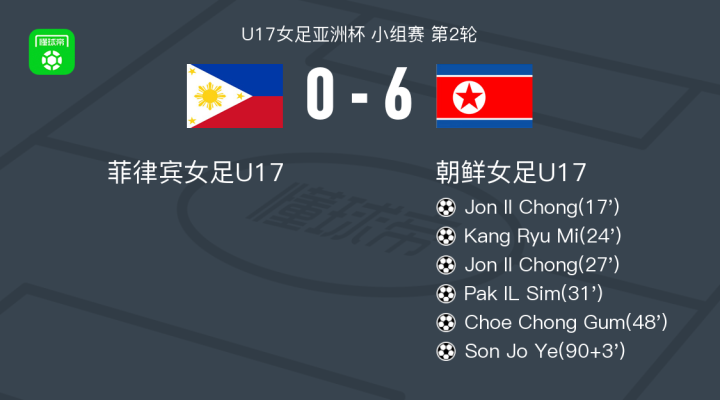 在U17女足亚洲杯小组赛第2轮中,菲律宾女足U17主场迎战朝鲜女足U17。朝鲜女足U17的Jon Il Chong攻入两球,Kang Ryu Mi、Pak IL Sim、Choe Chong Gum和Son Jo Ye也各自有进球。最终比分是菲律宾女足U17 0-6 朝鲜U17。