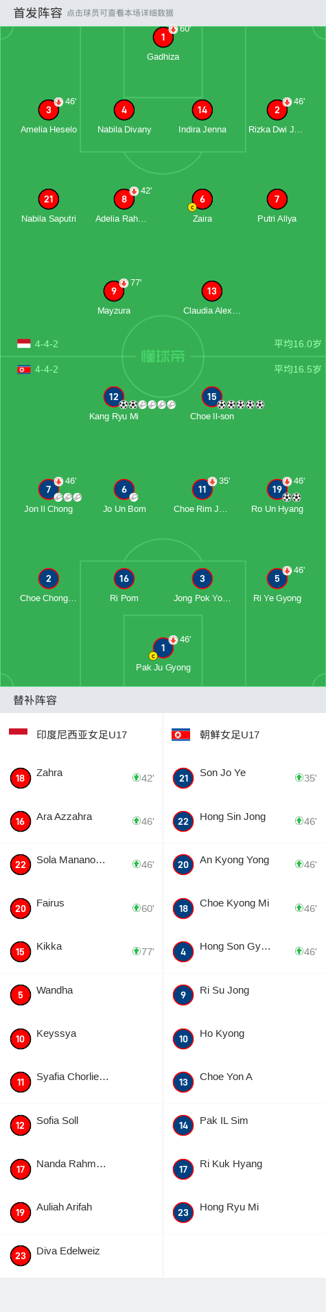 第11分钟,朝鲜女足U17球员Jon Il Chong助攻Kang Ryu Mi打入一球。
