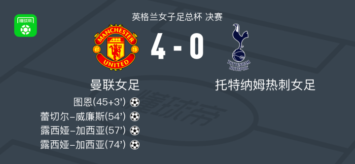 5月12日,英格兰女子足总杯决赛上演了一场激动人心的比赛,曼联女足坐镇主场迎战托特纳姆热刺女足。比赛中,图恩、蕾切尔-威廉斯和露西娅-加西亚分别在关键时刻攻破对方球门,最终曼联女足以4比0的比分完胜托特纳姆热刺女足夺冠,王霜在第54分钟替补登场。