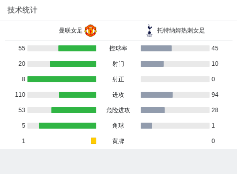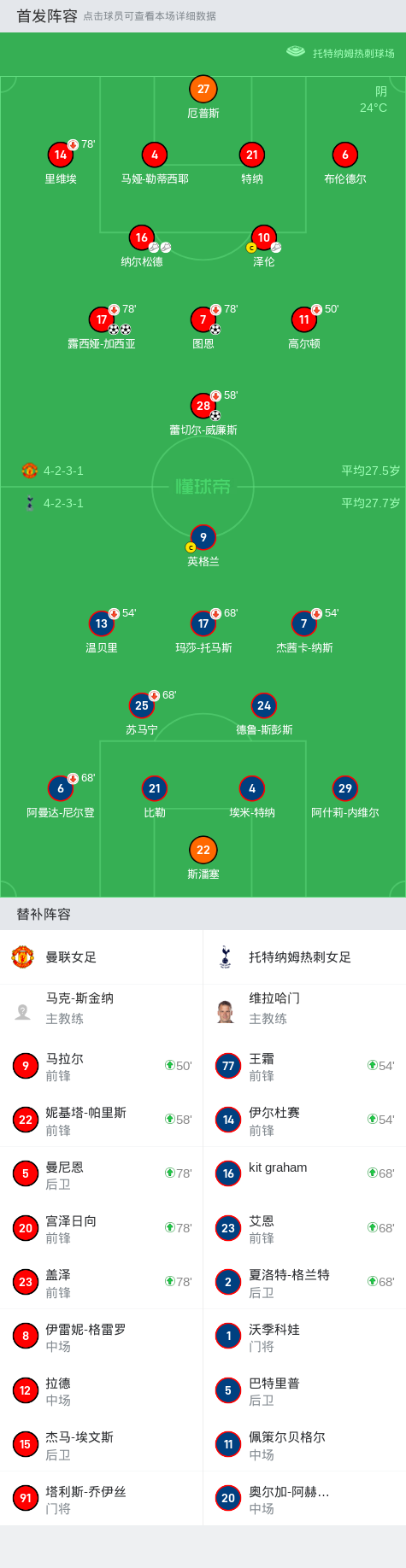 上半场补时第3分钟,曼联女足球员纳尔松德助攻图恩打入一球。