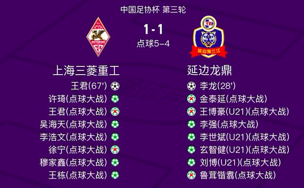 北京时间5月15日中国足协杯第三轮,上海三菱重工主场对阵延边龙鼎,王君和李龙分别建功,常规时间两队战成1-1,双方战至点球大战,最终上海三菱重工通过点球淘汰延边龙鼎,晋级第四轮,将对阵成都蓉城。