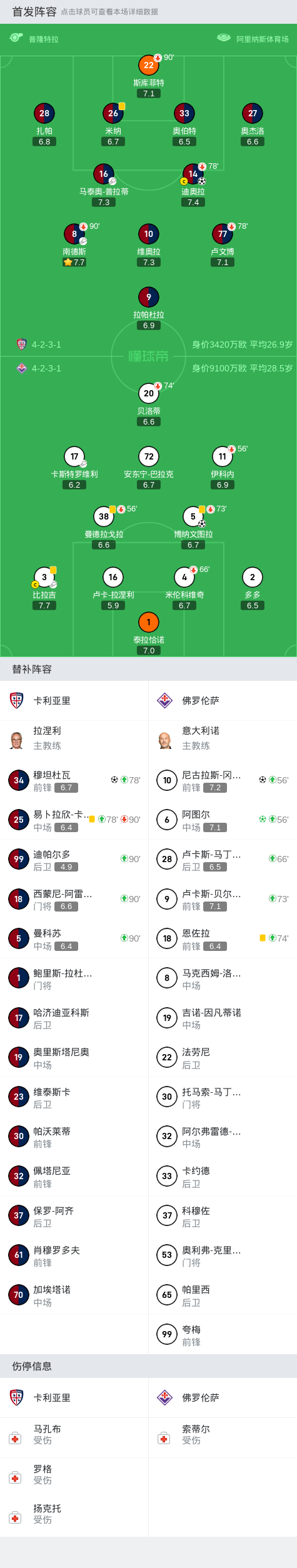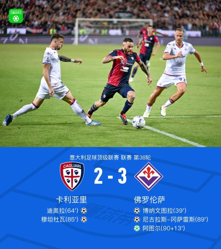 扫描下载懂球帝首页>动态> 拉涅利告别战卡利亚里2-3佛罗伦萨,阿图尔补时点射绝杀