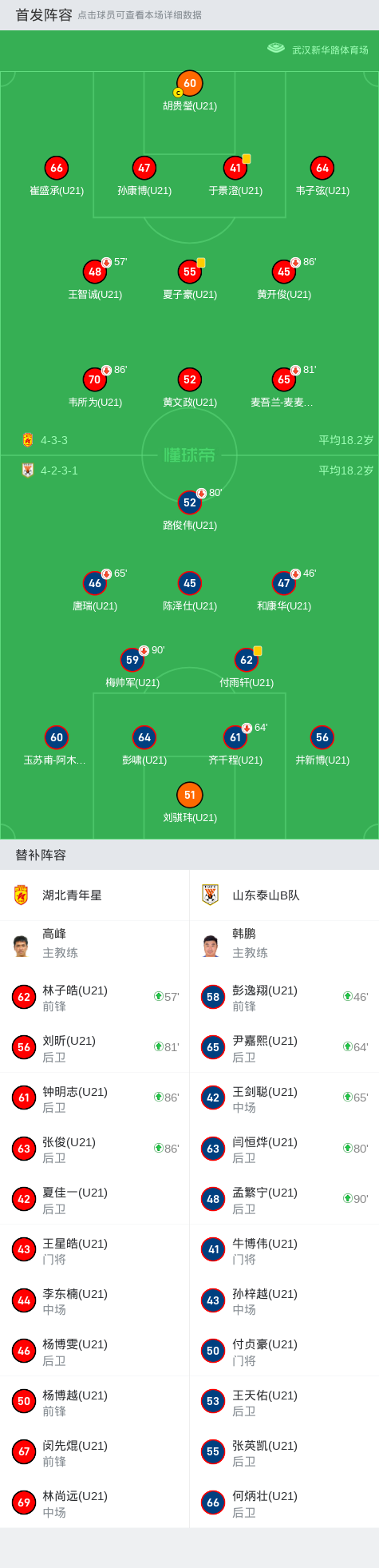 北京时间5月24日中国足球乙级联赛 预赛阶段 第9轮,湖北青年星主场对阵山东泰山B队。最终比分湖北青年星 0-0 山东泰山B队。