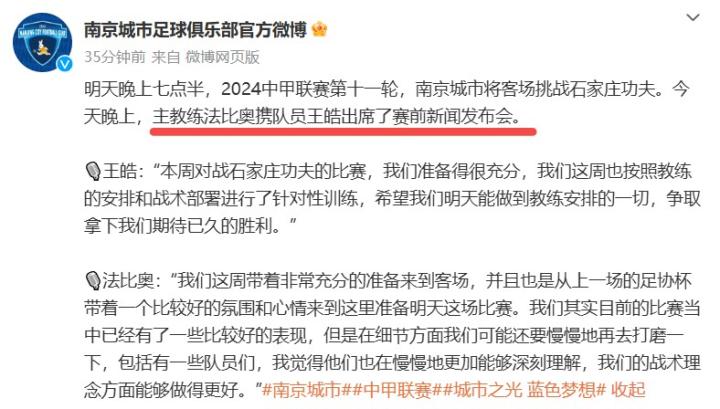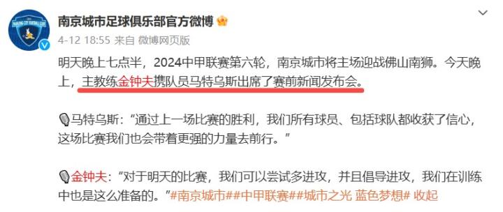 24日赛前新闻发布会,南京城市官方@南京城市足球俱乐部 写到球队主教练为法比奥-科尔特斯,韩国教练金钟夫或已经下课。