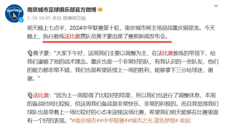此前在5月17日的赛前新闻发布会上,南京城市就将法比奥-科尔特斯写为了主教练,而在5月10日,法比奥还是执行教练。